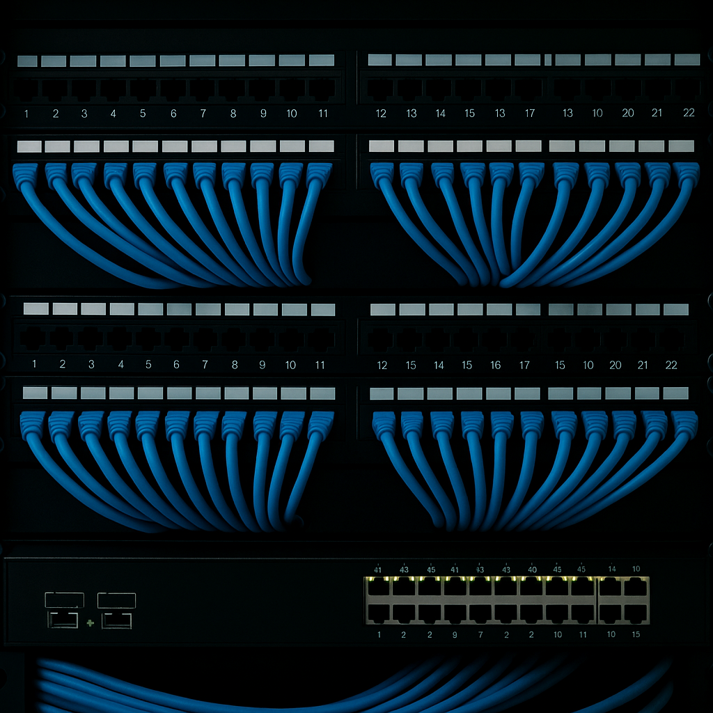Diseño e instalación de infraestructura de redes con racks, switches, canalización y sistemas de telecomunicaciones confiables.
