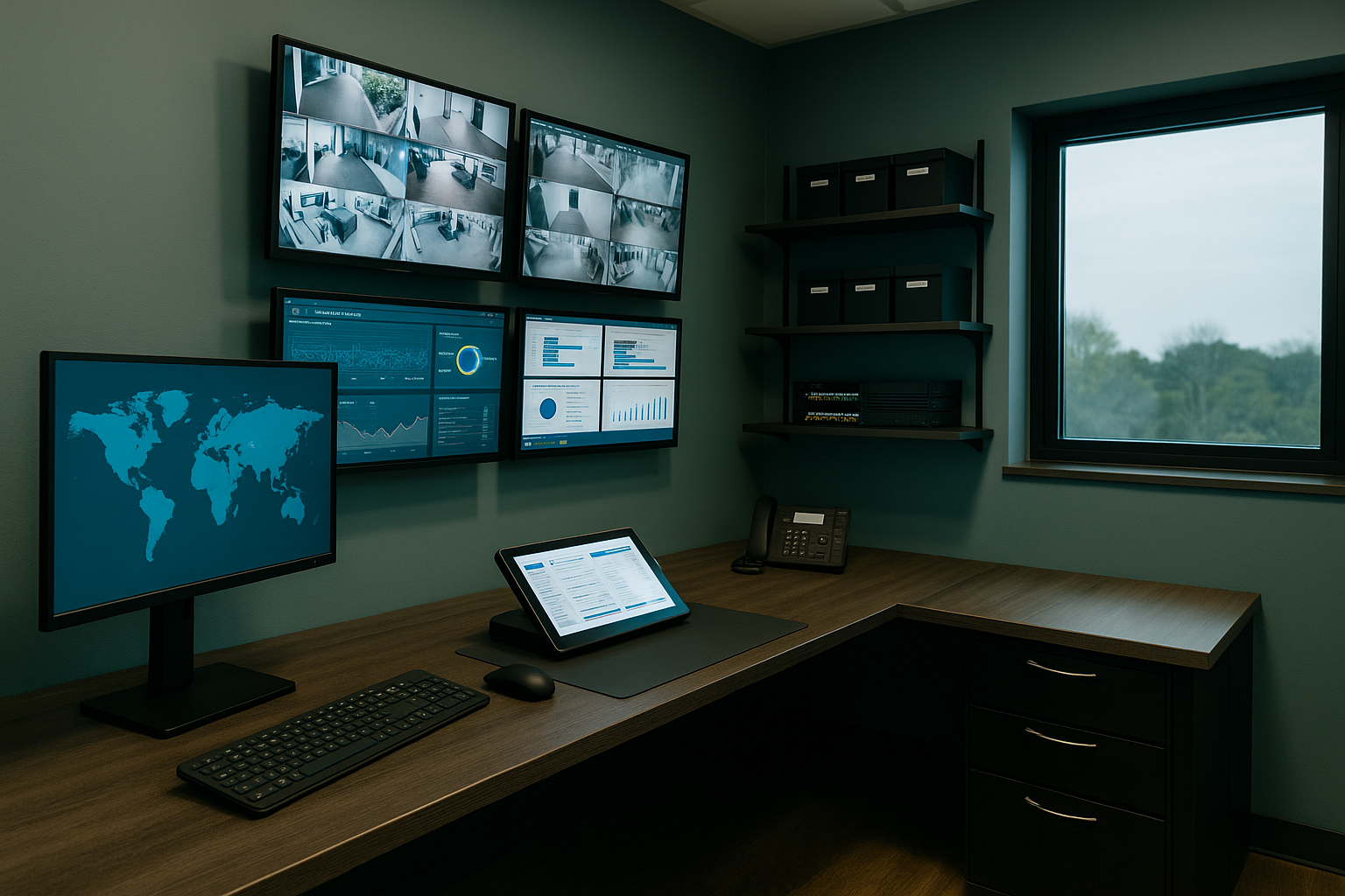 Diseño de salas de control con pantallas, software de gestión y asistencia 24/7. ahora una imagen de esto